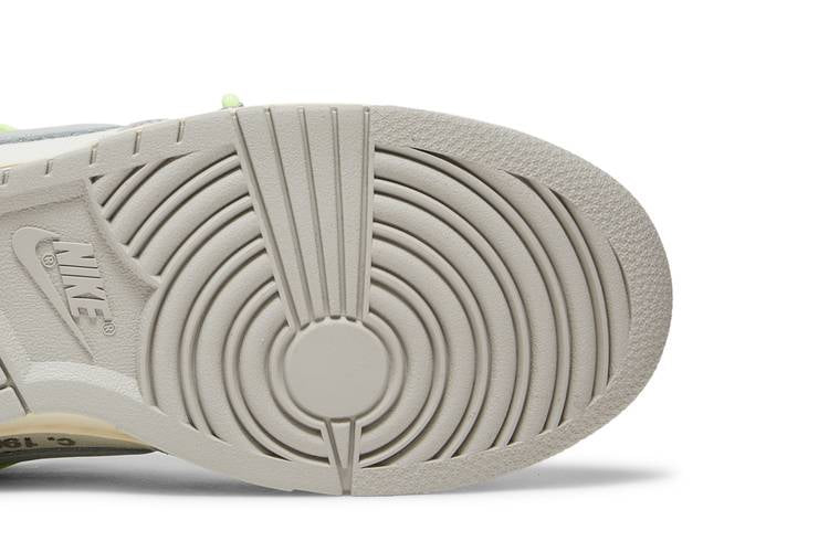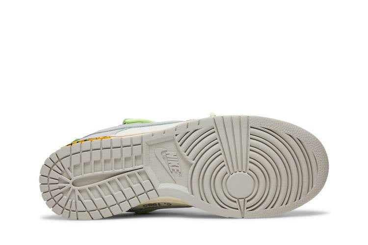 The Nike Dunk Low Off-White Lot 43 is a limited edition sneaker from the ‘Dear Summer’ collection by Virgil Abloh. It features a white leather upper with grey canvas overlays and signature Off-White details such as a plastic zip tie, printed Helvetica text, and colorful accents on the lacing system, zip tie, tongue, and Swoosh tab. Limited to fifty pairs, each shoe is marked with a ‘43 of 50’ badge on the lateral midsole. This collaboration combines classic Nike Dunk elements with unique Off-White design touches for a distinctive look.
