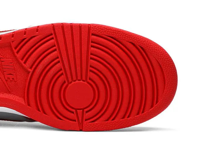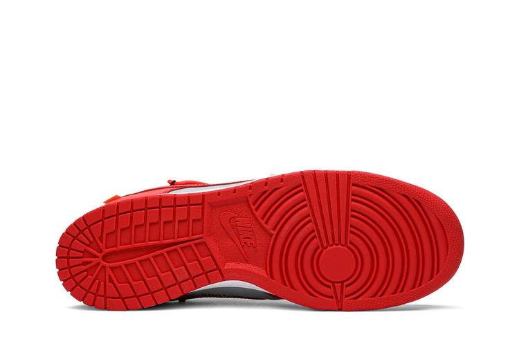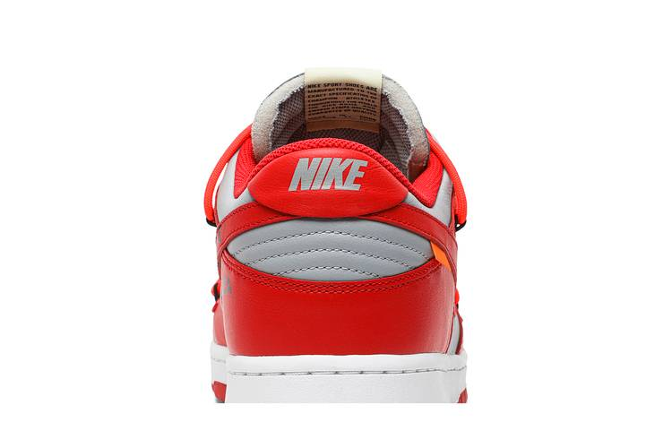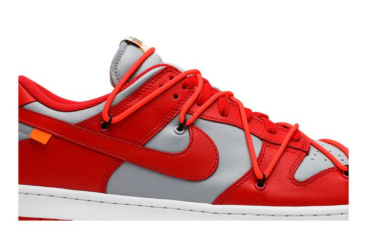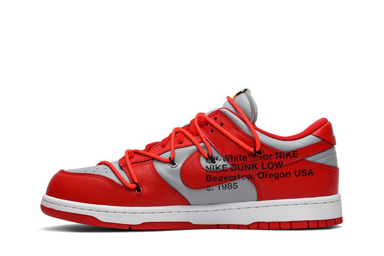The Nike Dunk Low Off-White University Red features a retro design with grey leather and university red overlays. Virgil Abloh's deconstructivist style is showcased with exposed tongue foam, a floating heel tab, and secondary lacing. The sneaker also includes signature Off-White branding details such as a blown-up text graphic on the medial side and a flagged Swoosh on the lateral side. The duo-toned rubber cupsole adds durability and traction to this unique collaboration between Off-White and Nike.