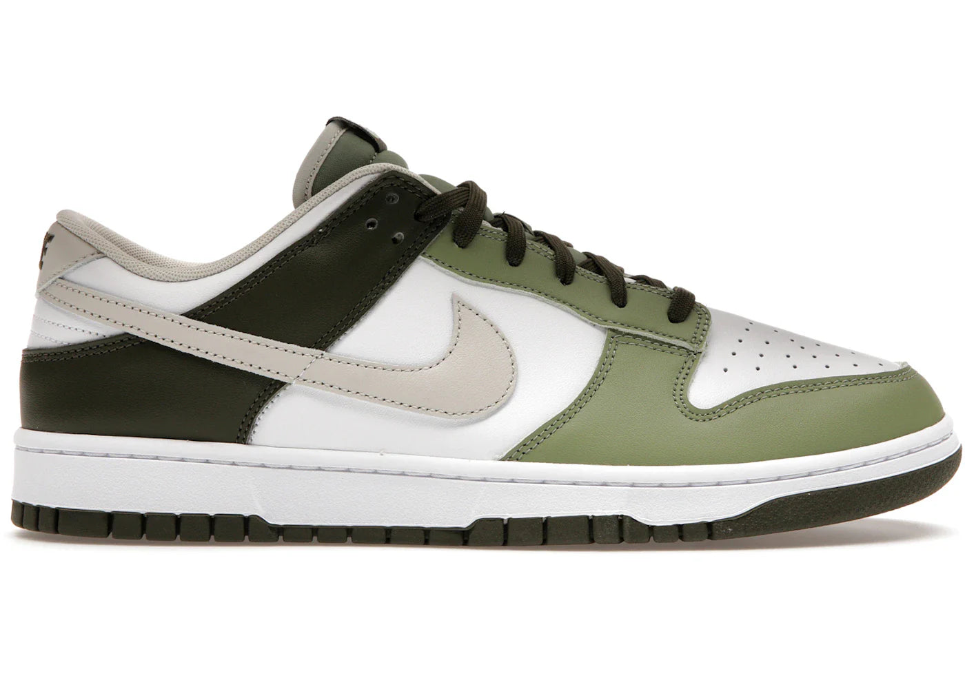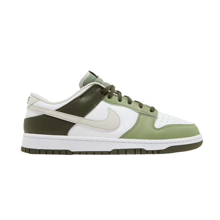 The Nike Dunk Low Oil Green Cargo Khaki features a leather upper in white with Oil Green and Cargo Khaki overlays. Light Bone accents highlight the Swoosh, heel tab, and branding. A white rubber midsole and green rubber outsole complete the design. Released on June 10, 2023, the Nike Dunk Low Oil Green Cargo Khaki is available now at Side Kicks.