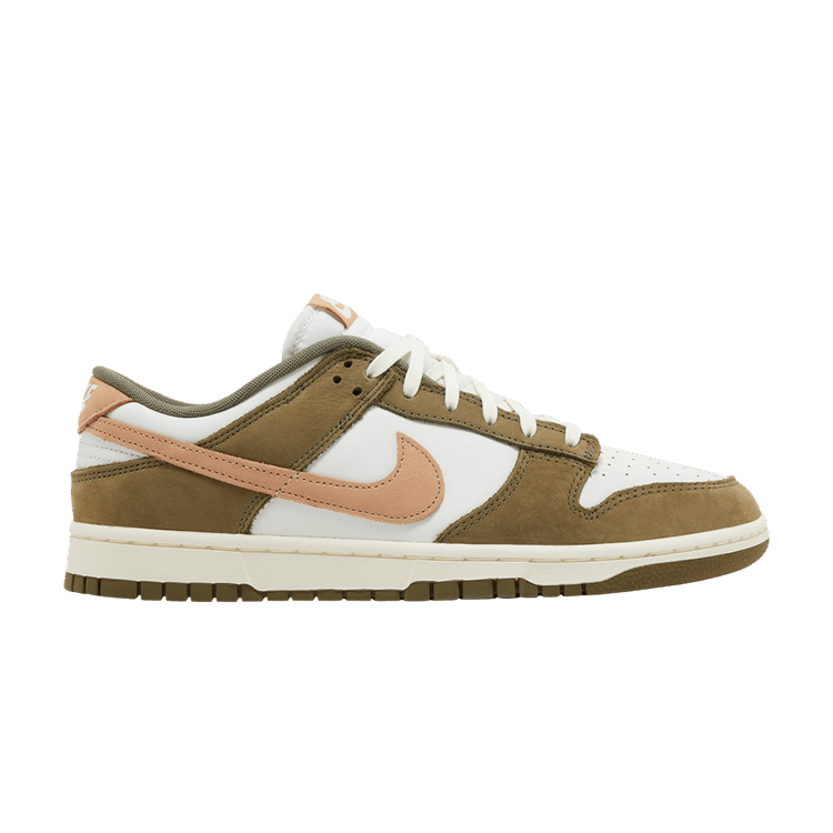 The Nike Dunk Low Premium Medium Olive Hemp features a smooth white leather upper with perforations for airflow. Olive nubuck overlays cover the heel, collar, and toecap, while peach-beige leather accents the Swoosh and heel tab. The olive mesh sockliner and peach-beige tongue tag complete the design. The olive rubber outsole includes concentric circles and grooves for traction. Released on July 4, 2024, the Nike Dunk Low Premium Medium Olive Hemp is available now at Side Kicks.