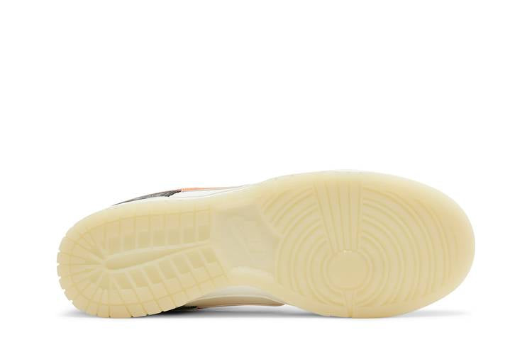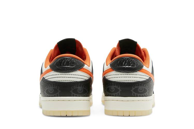 The Nike Dunk Low PRM Halloween (2021) features a glow-in-the-dark translucent rubber outsole and black leather overlays with tonal graphics that illuminate in the dark. The upper is made of off-white leather with a Starfish orange synthetic leather Swoosh. The design includes a spider graphic on the tongue, collar lining, and insole. The shoe also has a Sail leather upper with black overlays, orange Swooshes, and subtle glow-in-the-dark eye graphics. The Halloween-inspired design is completed with a woven tongue tag.