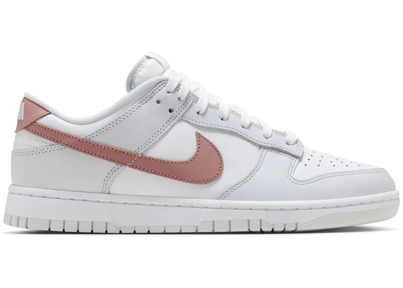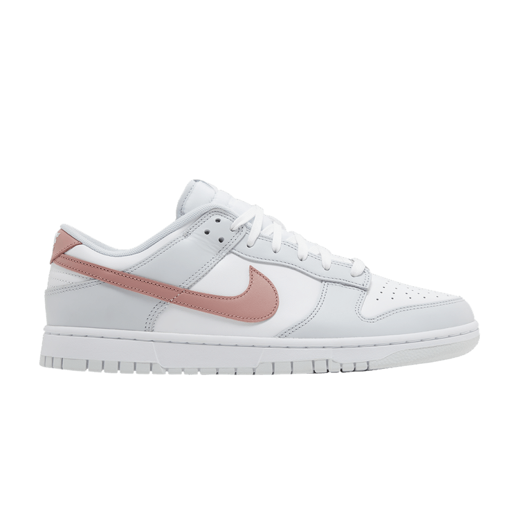 The Nike Dunk Low Retro Red Stardust Pure Platinum features a white leather upper with platinum cross-straps and Stardust Red accents on the heel lip and Swoosh. It includes a grippy rubber sole with pivot circles for traction and a foam midsole for cushioning. Released on November 18, 2023, the Nike Dunk Low Retro Red Stardust Pure Platinum is available now at Side Kicks.