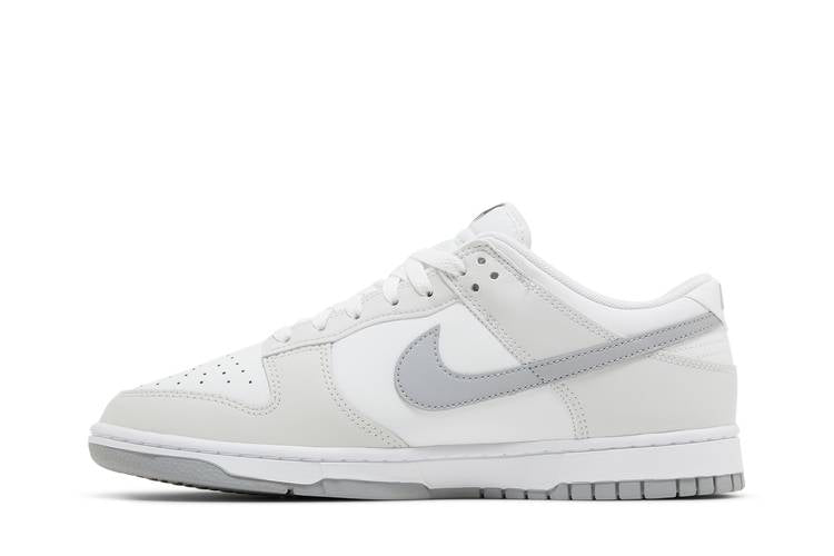 The Nike Dunk Low 'Summit White Light Smoke Grey' features an all-leather upper in chalk white with pale grey overlays at the forefoot and heel. Complemented by a grey Swoosh and Nike branding on the tongue tag and back tab, the shoe boasts a rubber cupsole with white sidewalls and a grey rubber outsole for enhanced traction. Inspired by basketball, this Retro model showcases a color-blocking effect with white and Light Smoke Grey leather overlays, creating a sleek and stylish appearance.