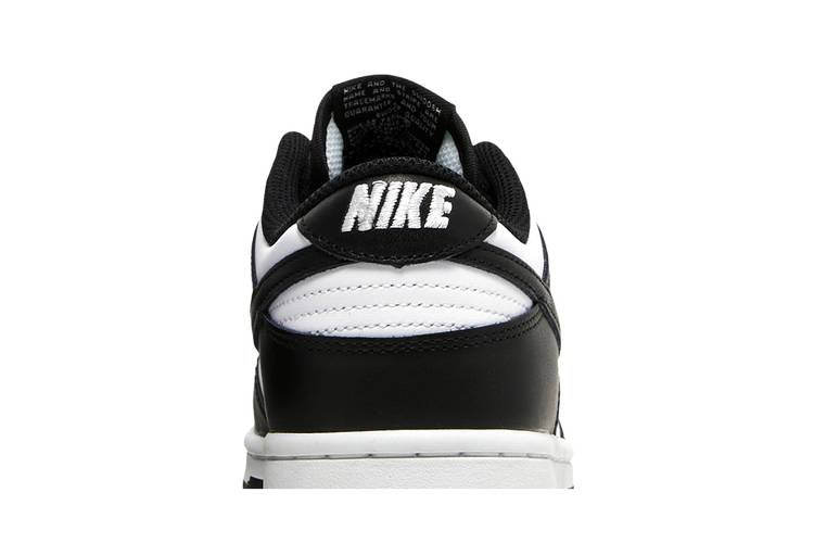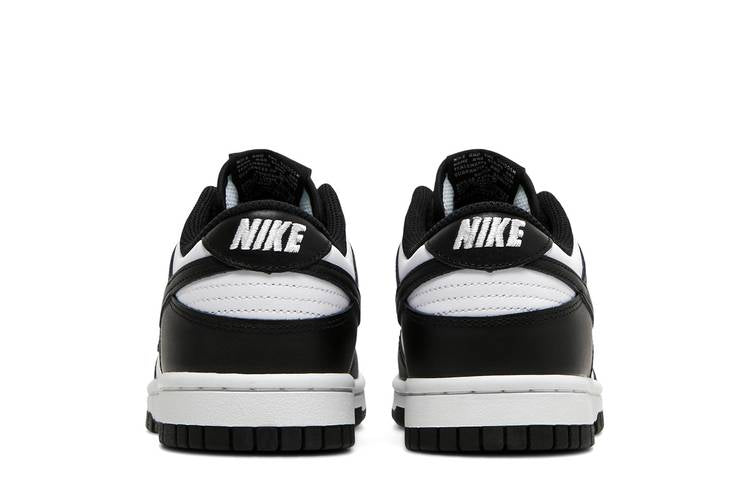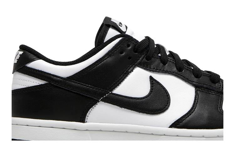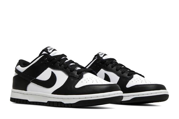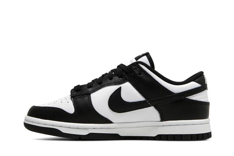 The Nike Dunk Low Retro White Black Panda (Women's) features a classic color blocking design on a vintage silhouette originally released in 1985. The all-leather upper is crisp white with contrasting black overlays and a black Swoosh. Nike branding is present on the heel tab and woven tongue tag. The durable rubber cupsole has a basketball-specific traction pattern for added grip. This sneaker is a timeless addition to any wardrobe.