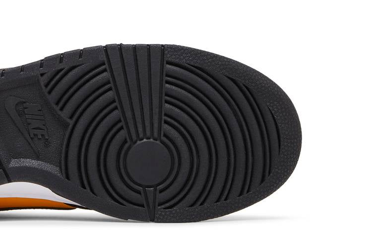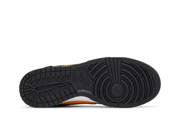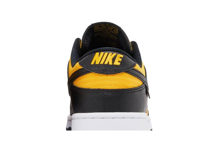 The Nike Dunk Low Reverse Goldenrod (2024) combines smooth goldenrod leather on the forefoot with black tumbled leather overlays and a woven goldenrod textile upper. Featuring classic perforations on the toe box and a white foam midsole, this shoe offers a distinctive design. The black rubber outsole provides traction and impact absorption with grooves and circles. Nike branding is prominent, including embroidered logos, a hang tag with a mini Nike Swoosh, and branding on the tongue patch, insole, and outsole. Released on February 8, 2024.