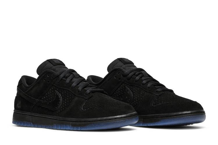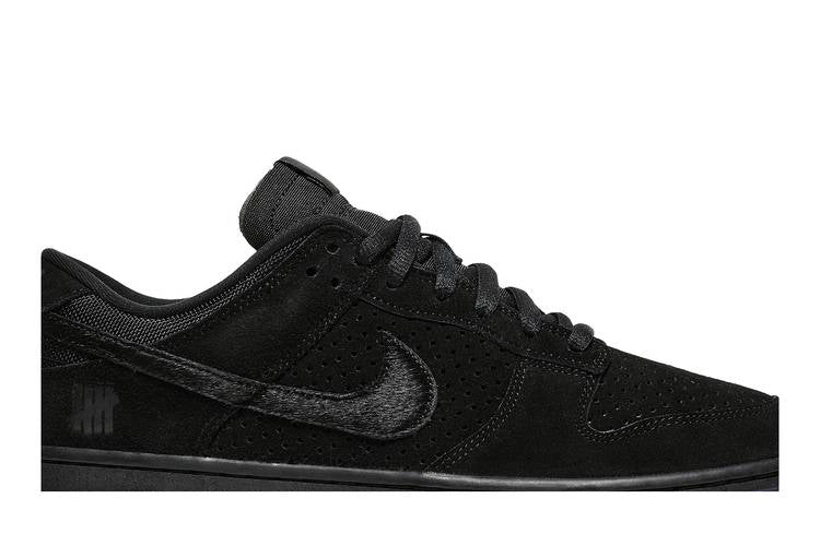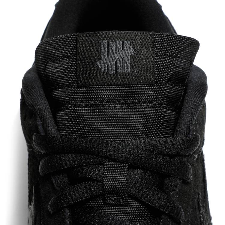 The Nike Dunk Low SP Undefeated 5 On It Black is part of the Dunk vs AF-1 series by the LA retailer. It features a mix of materials including perforated suede, smooth suede, pony hair, mesh, and nylon. The sneaker showcases Undefeated's Five Strikes logo on the tongue tag and heel. Set on a black midsole and translucent rubber outsole, this triple-black edition offers a unique and stylish design.