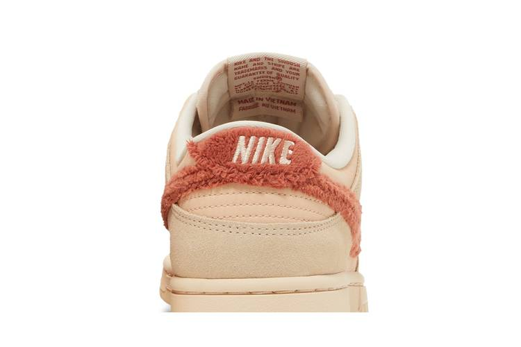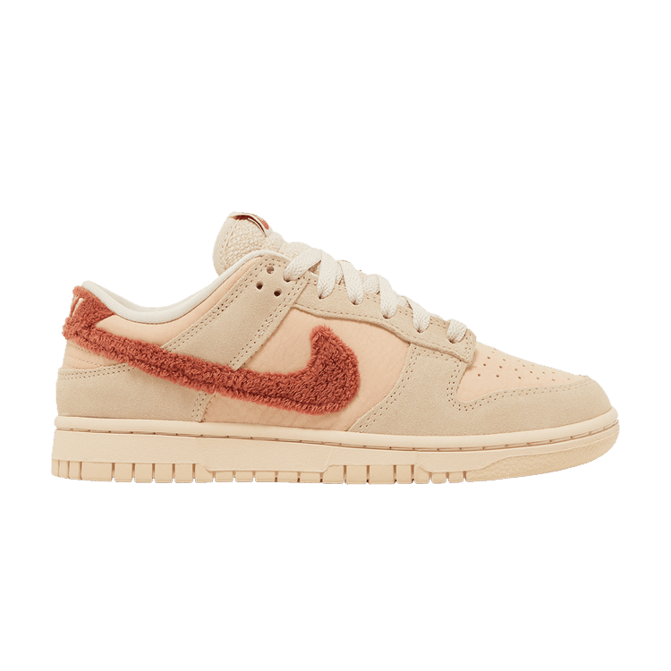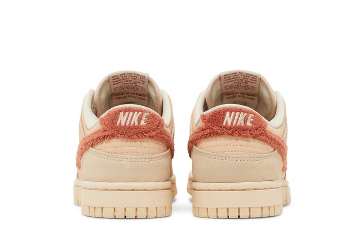 The Nike Dunk Low Terry Swoosh (Women's) features a mix of leather and suede materials in cream, coral, and pearl rose hues. The terry cloth heel tab and Swoosh add a cozy touch to the design. With a perforated toe cap, cotton laces, and a durable rubber cupsole, this shoe offers both style and functionality. Released on December 1st, 2022, this Nike Dunk Low is a stylish addition to any sneaker collection.