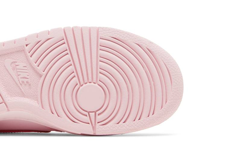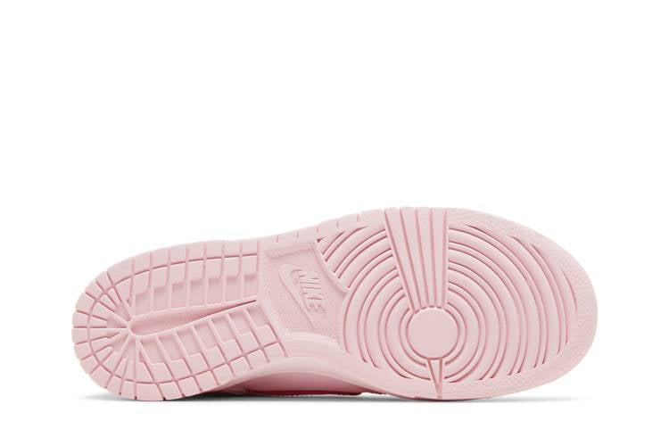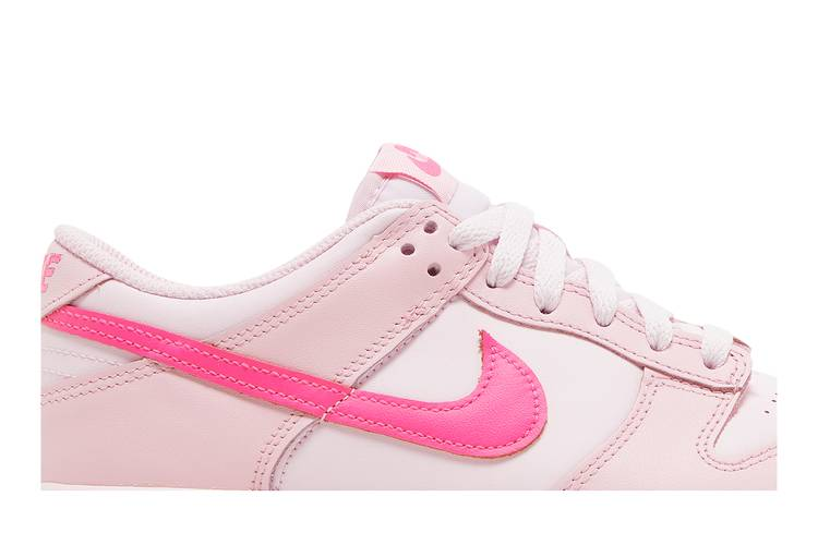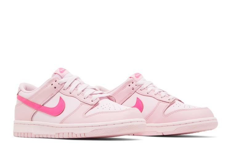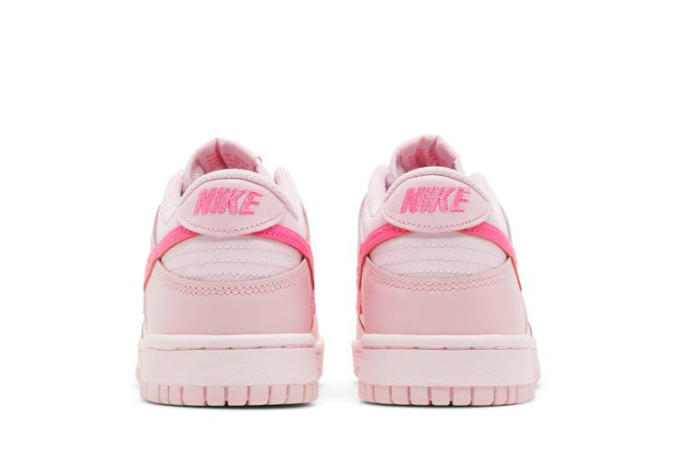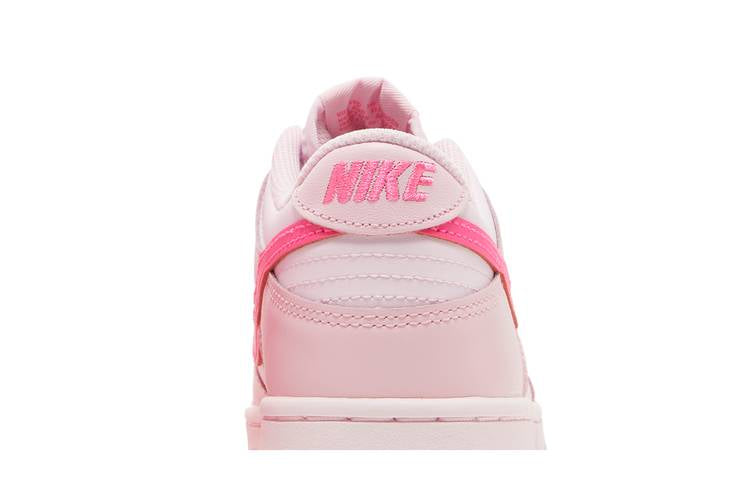 The Nike Dunk Low Triple Pink (PS) is a children's sneaker featuring a tonal pink colorway. The leather upper includes a padded low-cut collar and breathable perforations on the toe box. Hyper Pink accents the Swoosh and branding details, while a color-matched rubber cupsole with a foam wedge provides cushioning. Made from recycled polyester material, the shoe is both stylish and sustainable.