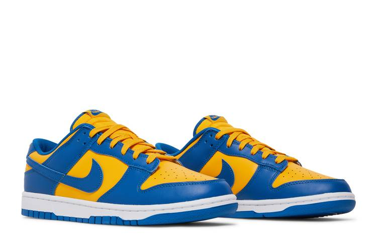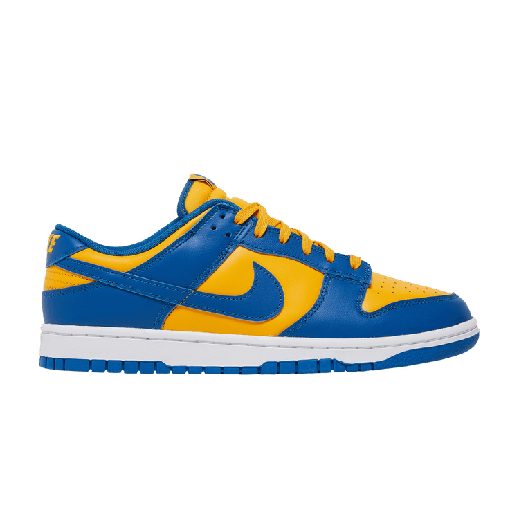 The Nike Dunk Low UCLA showcases a University Gold leather upper with Blue Jay leather overlays, inspired by the colors of UCLA. The shoe features a golden tongue with blue accents, a Swoosh in matching blue, and a Nike wordmark on the back tab. The traditional rubber cupsole has white sidewalls and a blue rubber outsole for traction. The design pays homage to the Bruins of Los Angeles, making it a must-have for fans of the team or sneaker enthusiasts alike.