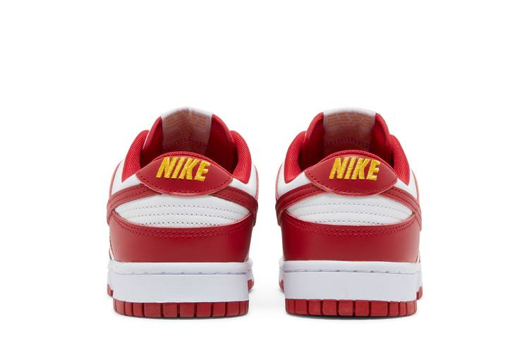 The Nike Dunk Low USC features a leather upper with a white base and crimson overlays, accented with golden yellow details. The design pays homage to the original ‘Be True to Your School’ series from 1985. This sneaker showcases a vintage-inspired look with a rubber cupsole, white sidewalls, and a red rubber outsole. Perfect for fans of the University of Southern California Trojans, this shoe combines style and comfort with its classic color scheme and iconic Swoosh branding.