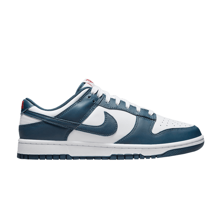The Nike Dunk Low Valerian Blue features a classic two-tone color blocking design with a white leather upper and contrasting blue overlays. The sneaker is accented with red details on the tongue label and heel embroidery. A traditional rubber cupsole with white sidewalls and a blue rubber outsole provides traction and durability. This retro-inspired silhouette pays homage to college basketball roots and offers a timeless look for casual wear.