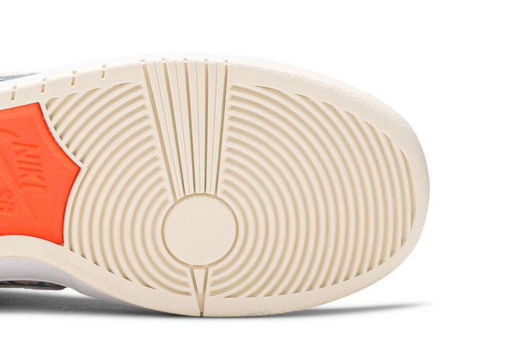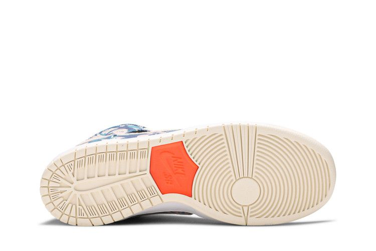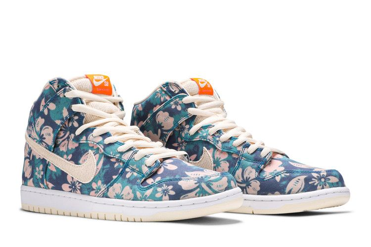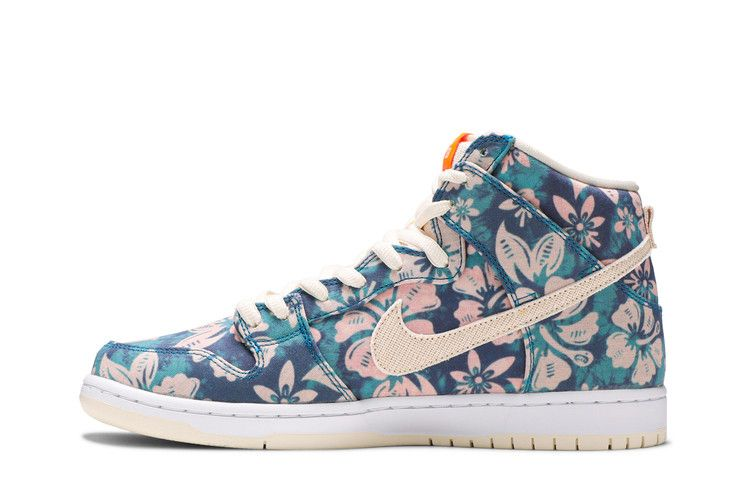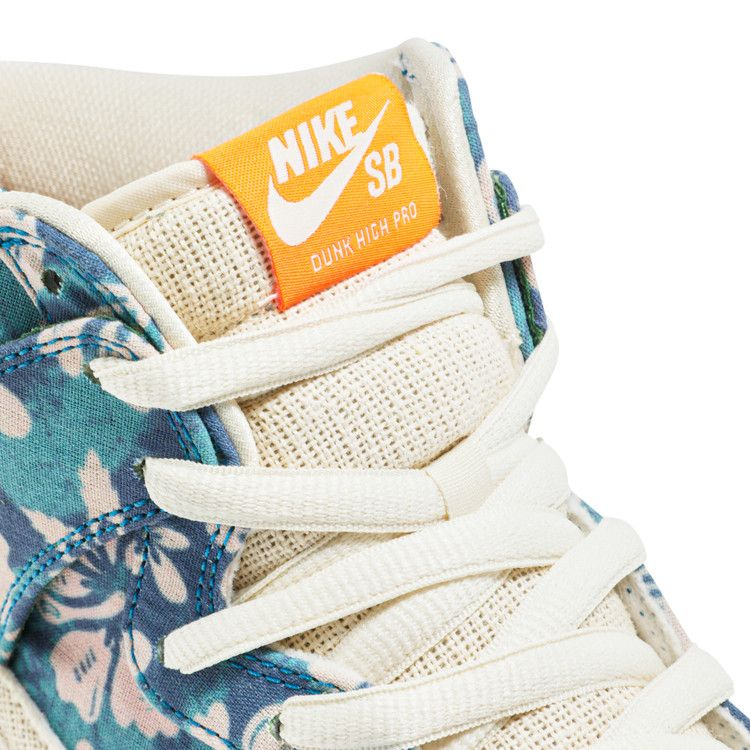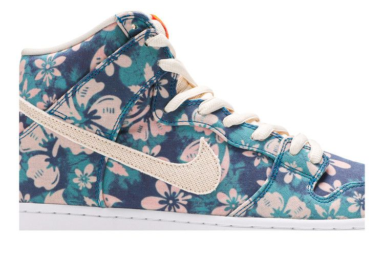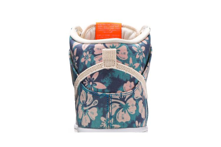 The Nike Dunk High SB ‘Maui Wowie’ features a floral-print textile upper with undyed hemp accents on the Swoosh and tongue. Tear-away design reveals a different floral print in red and orange hues. Green suede overlays on forefoot and heel, white midsole, cream rubber outsole.