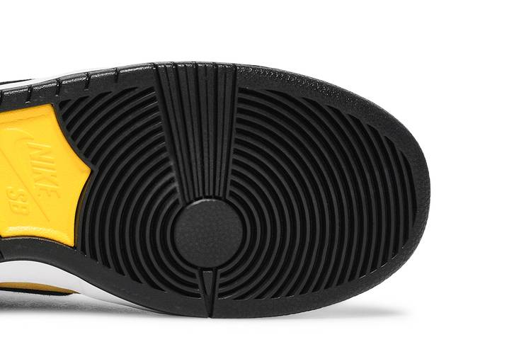 The Nike SB Dunk High Pro Reverse Goldenrod is a skate-inspired high-top shoe featuring nubuck uppers with a two-tone color scheme. The shoe showcases a bold yellow tone on the toe boxes, quarters, and collars, along with a puffy mesh tongue. Contrasting black accents can be found on the mudguards, eye stays, mid-foot Swooshes, and heels. Inspired by skate parks and a 1985 OG sneaker, this model was released on November 23rd, 2022.