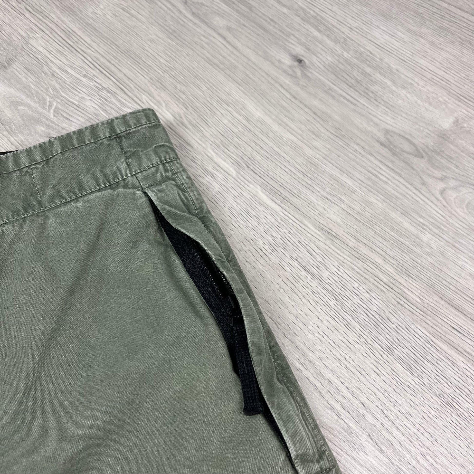 Musk Green Stone Island Bermuda cargo shorts with cargo-style flap pockets featuring a patch logo