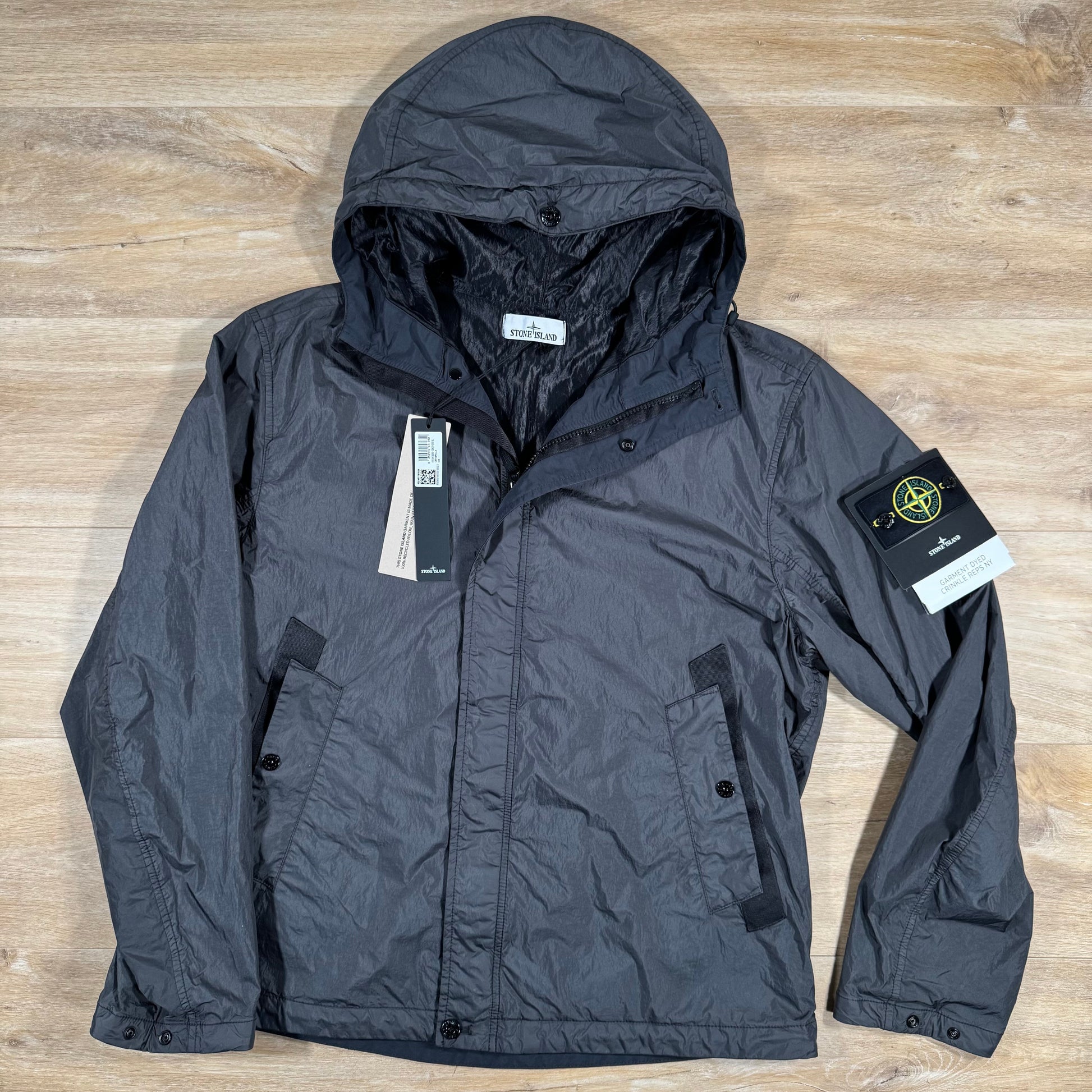 Stone Island hooded jacket crafted in lightweight recycled nylon rep with an ultra-tight weave and a resin-coated interior for wind resistance and mild water resistance. The resin treatment creates a unique crinkle texture with uneven color penetration. Features a hood with contour drawstring and central fixing button, slanted hand pockets with fixed flaps and button fastening on nylon tape, and the iconic Stone Island badge on the left sleeve. Includes tightening snaps at the cuffs, a drawstring hem, and a two-way zip fastening concealed by a snap-closure placket.