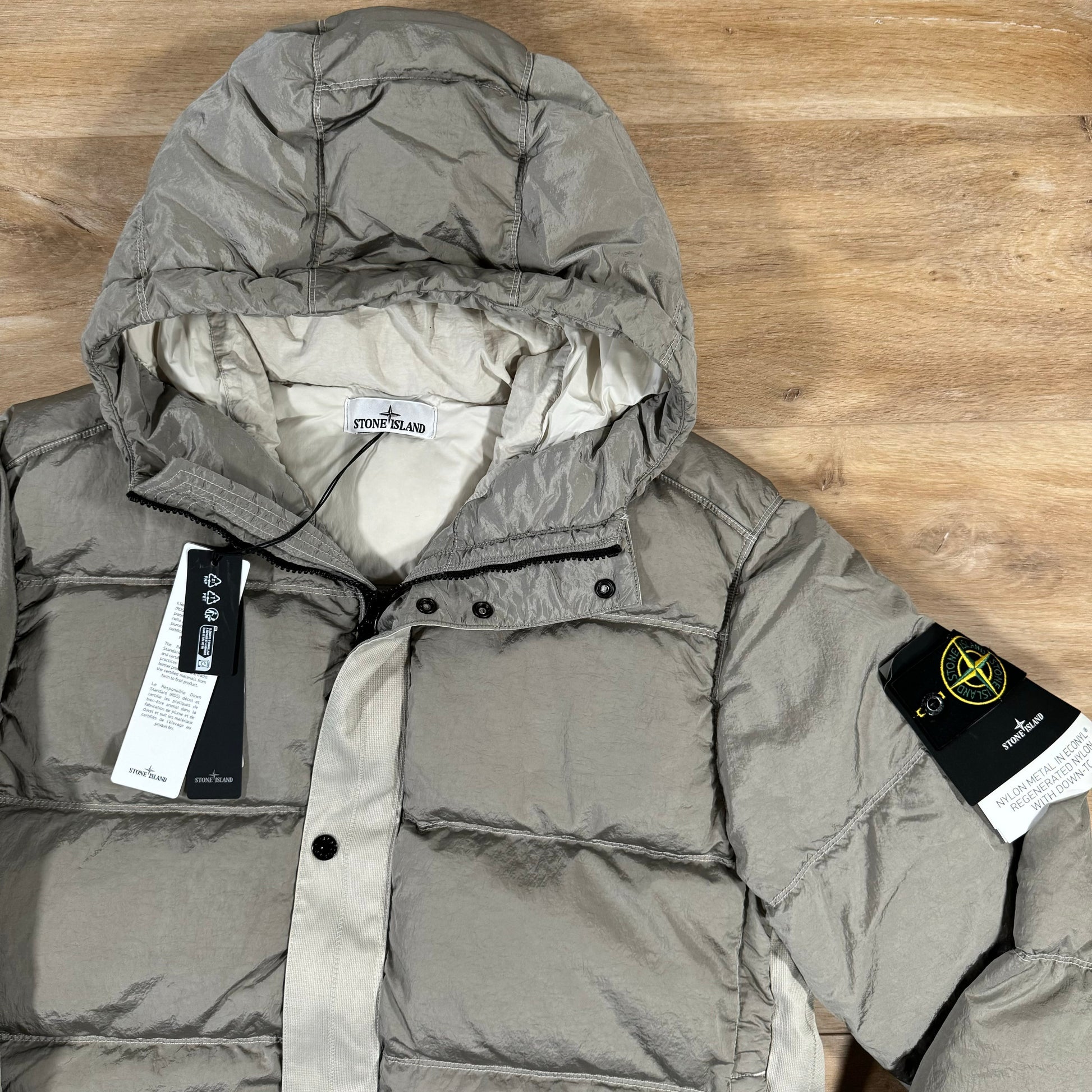 Stone Island Nylon Metal down jacket crafted from Nylon Metal with ECONYL® regenerated yarns and padded with premium feathers for warmth. It is garment dyed using a double colour recipe and treated with an anti-drop agent for water resistance. The jacket features a hood with contour drawstring, standing hand pockets with hidden zip closures, and nylon tape appliqué on the inner sleeve and sides. Additional details include elasticated cuffs, a drawstring at the bottom hem, plus the signature Stone Island badge on the left sleeve.